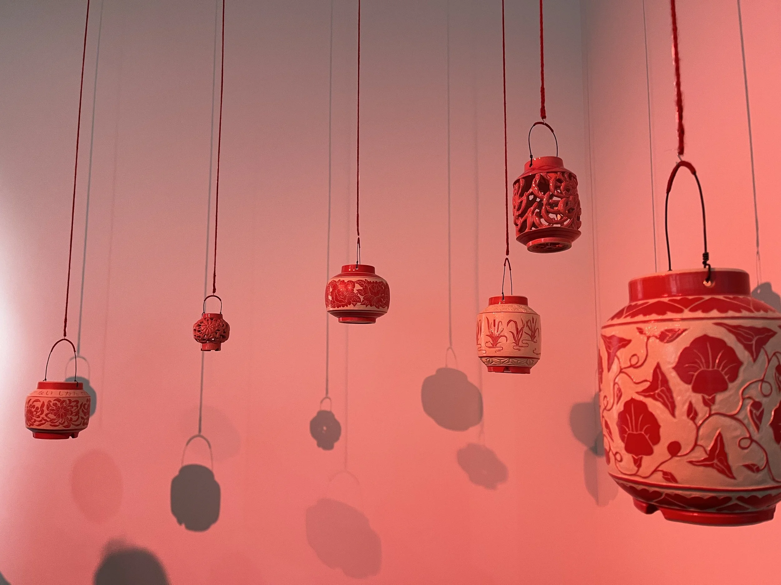 Ceramic lanterns, fishing line, crochet cordage, wire, embroidery floss