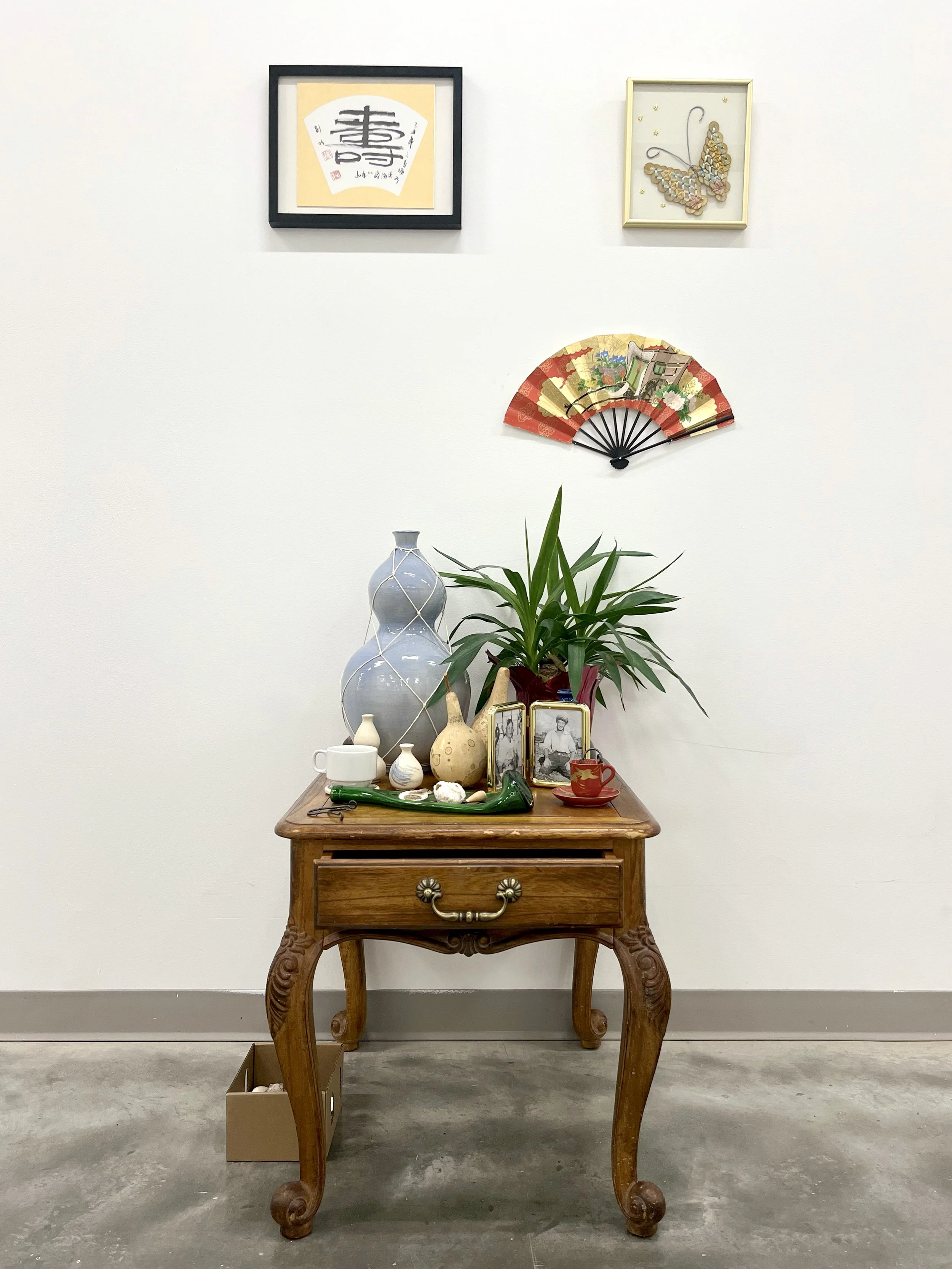 Ceramic vases, cordage, picture frames, fan, plant, dried gourds, shells, yen coins, fish hooks